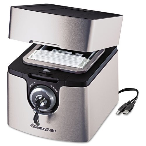 Affordable fire-resistant/waterproof data protection. Internal USB port connects your laptop or desktop computer (USB 2.0 U-cable included) to any 2.5" portable hard drive, flash drive, memory stick, MP3 player, or small digital camera. ETL verified fire protection for 1/2 hour at 1550F plus water protection for a full 24-hours fully submerged. Protects up to 60 CDs and DVDs. Double-sided sleeves included. Tubular key lock provides added security. Outer Width: 9 1/8"; Outer Depth: 10 7/8"; Outer Height: 9 3/4".
